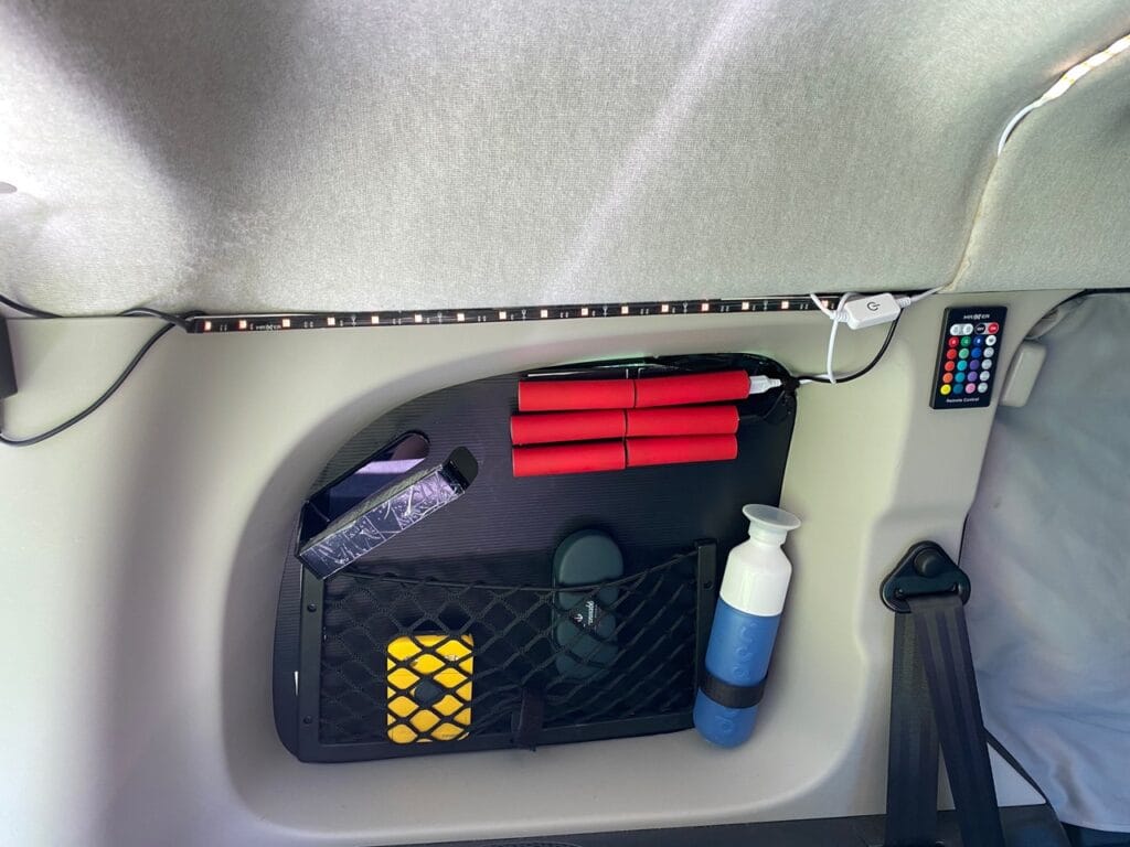 Met diezelfde Tesa tape heb ik er nog vanalles opgeplakt, van WC-rolhouder tot powerbanks met sterk klittenband en een dopperhouder. Ik vond dit al flink schelen in losliggende dingen en je kunt er makkelijk bij. Het zit ook goed vast, want dat is natuurlijk wel serieus iets om op te letten bij een camper. De dopper zat er bij mij dus ook alleen in als we op de camping stonden!